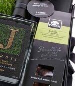 The set features a Premium 10-year-aged pear brandy by Jardi, a sleek metal flask, and hazelnut chocolate dragees, all beautifully packaged in an elegant laminated cardboard box. A gift that leaves a lasting impression with its refined style and exceptional quality. Every detail speaks of elegance and luxury, making it an unforgettable gesture.