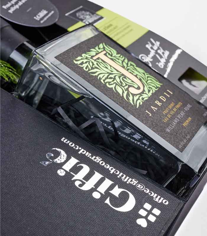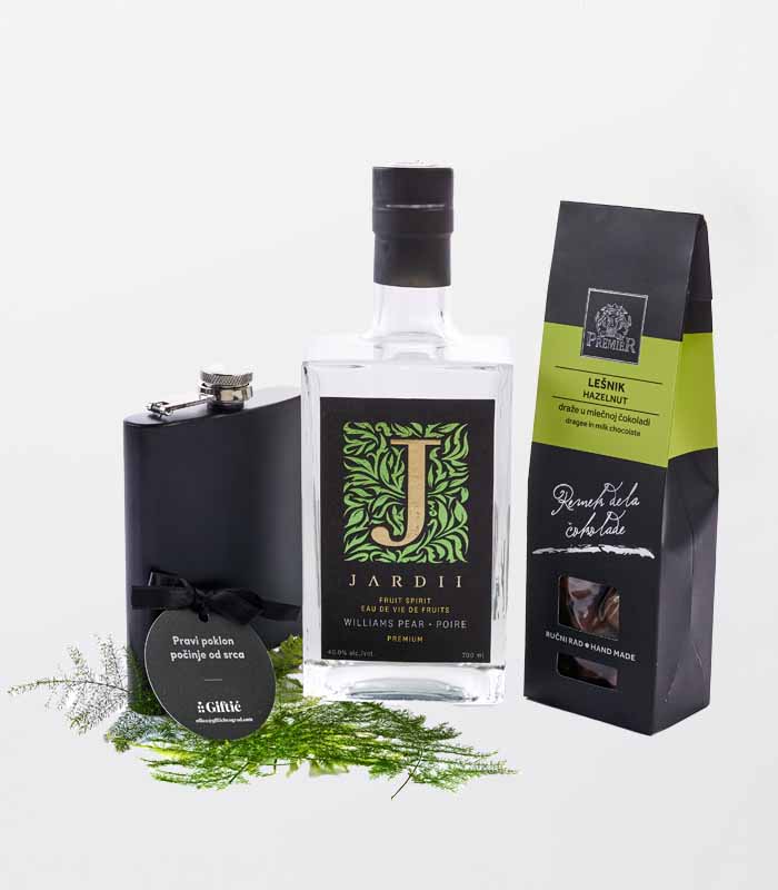 The set features a Premium 10-year-aged pear brandy by Jardi, a sleek metal flask, and hazelnut chocolate dragees, all beautifully packaged in an elegant laminated cardboard box. A gift that leaves a lasting impression with its refined style and exceptional quality. Every detail speaks of elegance and luxury, making it an unforgettable gesture.