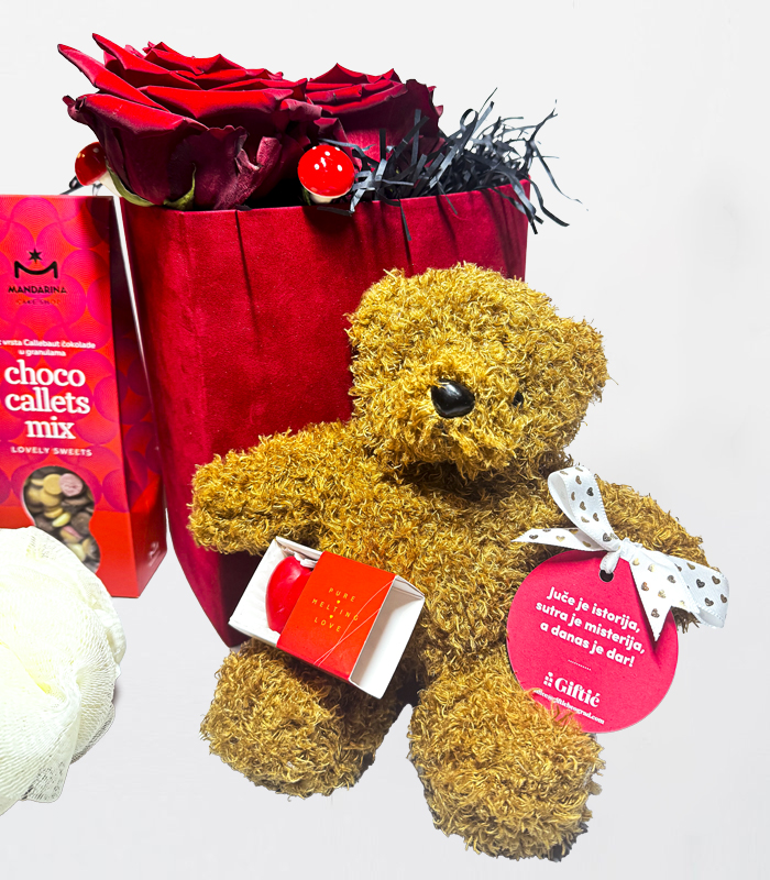 A plush teddy bear as a striking token of affection that fills the heart, accompanied by three red roses (the number and color of the roses may vary).