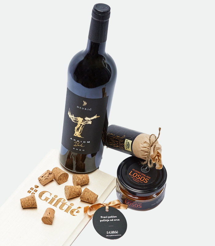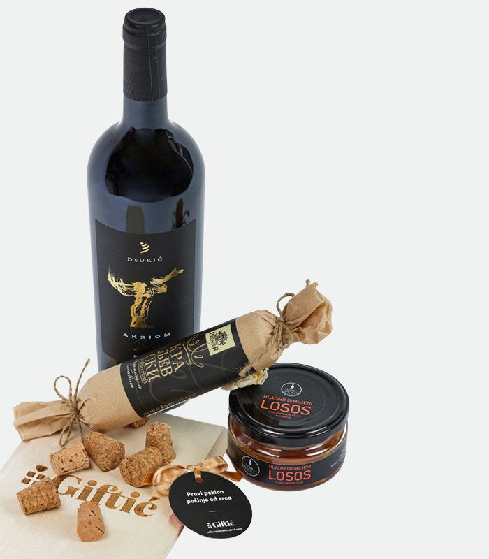 We’ve reached the pinnacle of gastronomic pairing with this set. Deurić Aksiom white wine, paired with hand-cut capriccio of cold-smoked salmon in extra virgin olive oil.