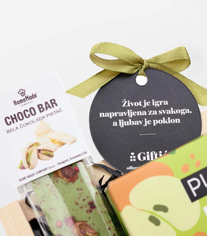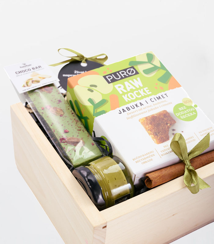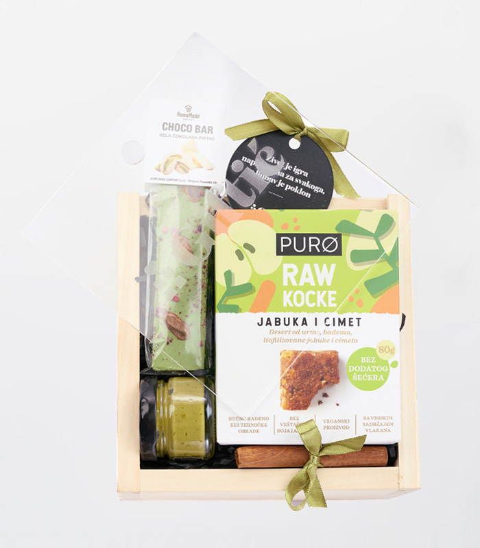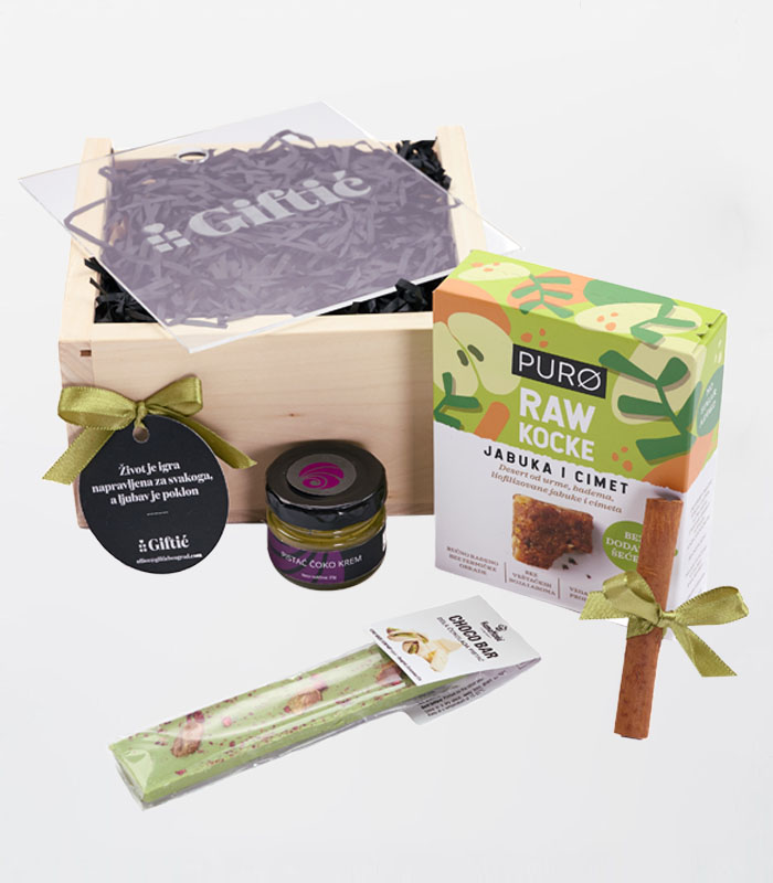 Poklon set Plemići danas mogu darovati svi bez ograničenja i svaki primalac će se osećati poput plemića. U njemu se nalaze zdrave kocke sa jabukom i cimetom, choco bar sa belom čokoladom i pistaćima, i premium namaz od pistaća. Savršen spoj ukusa koji će dragim osobama dočarati kako se nekada živelo kraljevski.