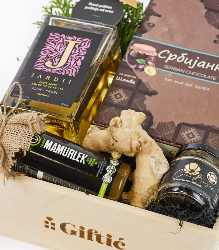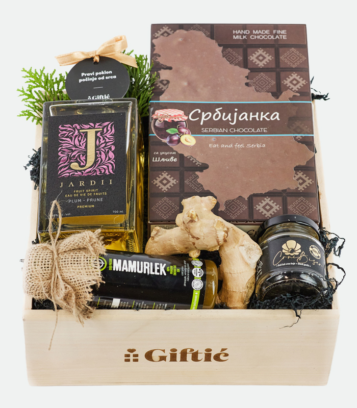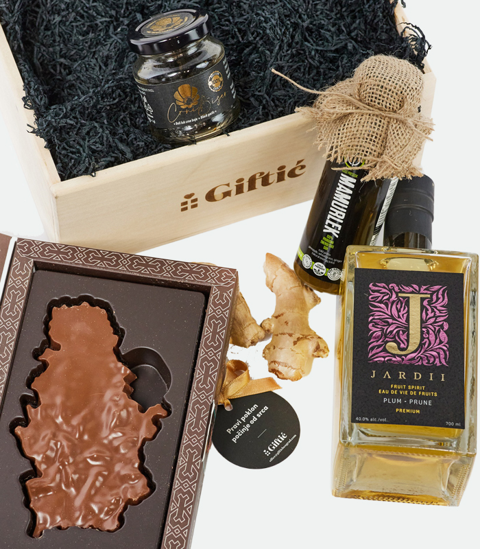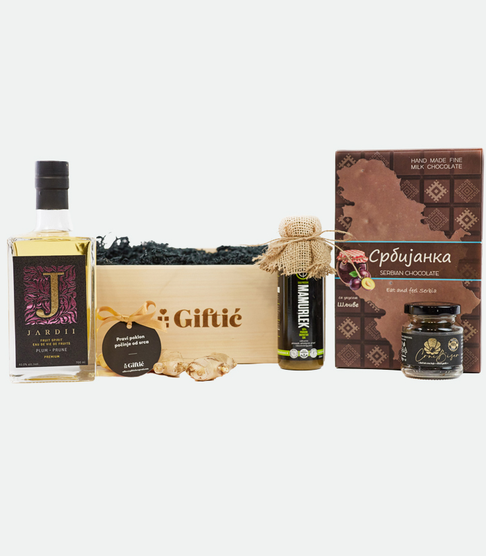 Ukoliko vaša draga osoba voli prave srpske proizvode, poklon Čačanska lepotica je pravi izbor. Poklon koji odiše rodoljubivošću, sažeta je domaćom barik premium rakijom od šljive, Srbijankom mlečnom čokoladom od šljive, fermentisanim belim lukom koji savršeno ide kao dodatak uz rakiju, a tu je i mamurlek energetski napitak.