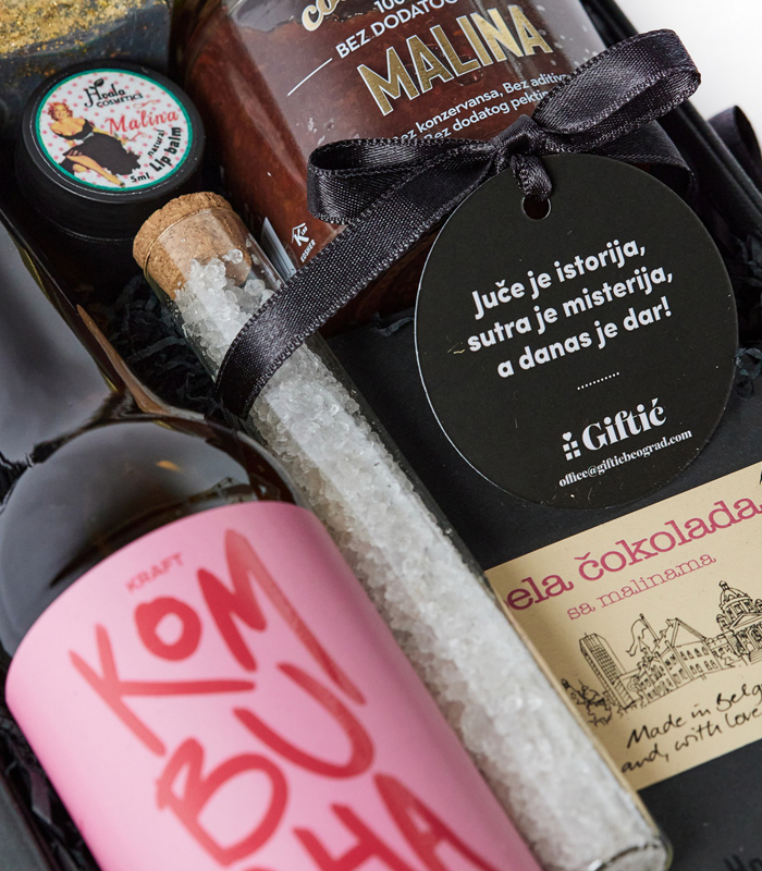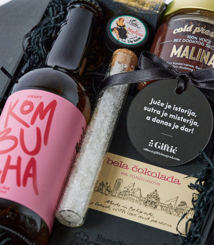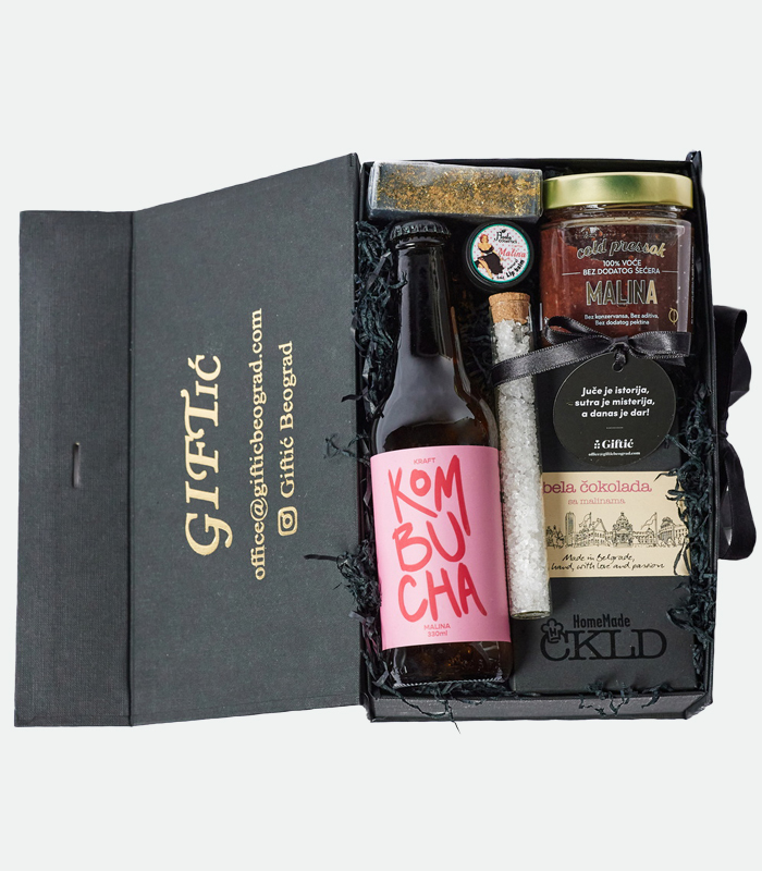 Kombucha je fermentisani čajni napitak koji je bogat probioticima, zdravim kiselinama i polifenolima koji imaju jako antioksidativno dejstvo sa ukusom maline. Ukombinovan sa džemom od maline u kojoj imamo 100% voće bez dodatih elemenata koji će ometati malinu, već pun ukus čiste maline! Ukoliko vašoj dragoj osobi nikad dosta maline, tu nam je vrhunska bela čokolada sa malinom i balsam za usne sa ukusom maline za slađe poljupce. Za kraj večeri smo ostavili za uživanje u sapunu sa aktivnim ugljem i morskom soli koji će opustiti celo telo!
