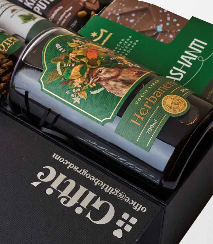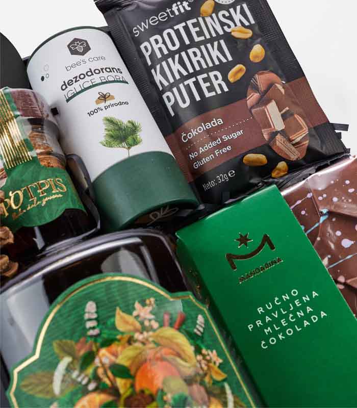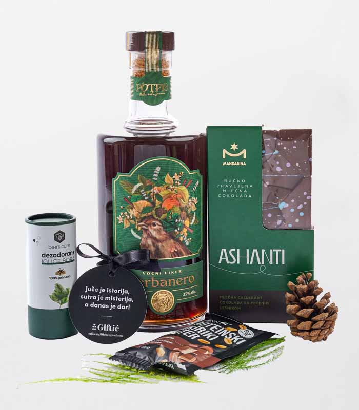 Poklon set Golija osmišljen je kao zelena oaza planinskih predela, donoseći mir, nežnost i svežinu. Ovaj set je savršen izbor za drage koleginice, žene, dame ili sestre – jednostavno, za nju. Sa pažljivo odabranim proizvodima poput likera od oraha u destilatu od jabuke sa medom i lekovitim biljem, mlečne čokolade sa pečenim lešnikom, proteinskog kikiriki putera, i prirodnog dezodoransa sa iglicama bora, poklon će sigurno očarati svaku osobu koja voli prirodne i premium proizvode. Dekoracija i pažljivo upakovana kartonska kaširana kutija dodatno naglašavaju eleganciju i pažnju prema detaljima. Golija je poklon koji oduzima dah, pružajući osećaj transformacije u mirnije, čistije prostore.