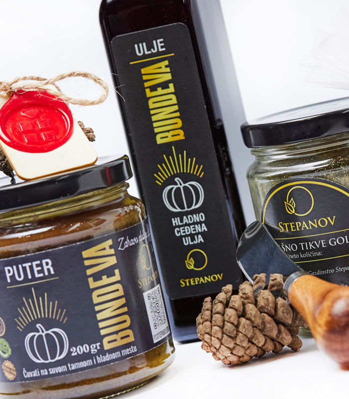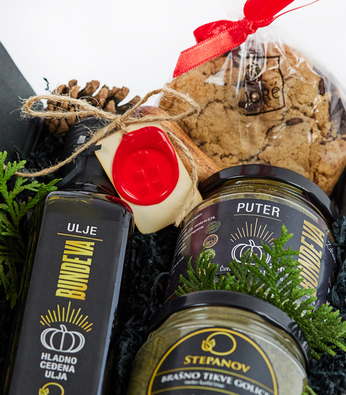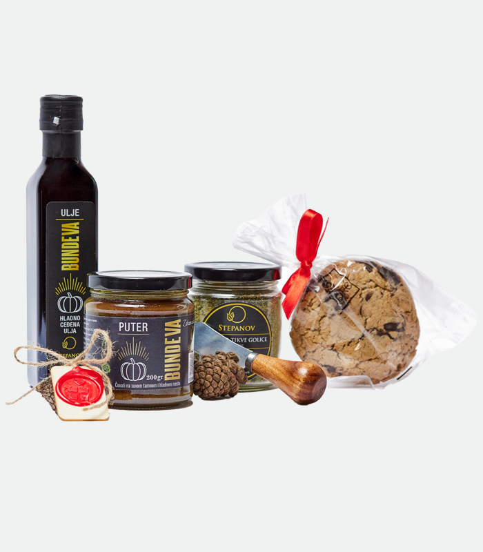Poklon paket sadrži zdrave bundevine proizvode od hladno ceđenog bundevinog ulja, koje će se odlično slagati sa brašnom tikve golice, puterom od bundeve, nož kako bi se puter lako razmazao i jedan Cookie koji će da stavi tačku na ceo ugođaj.