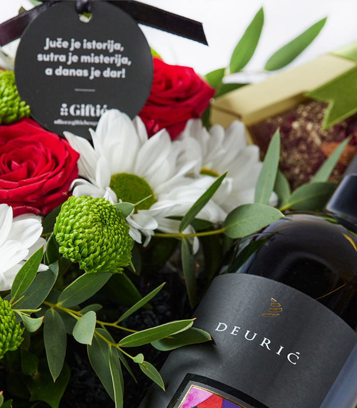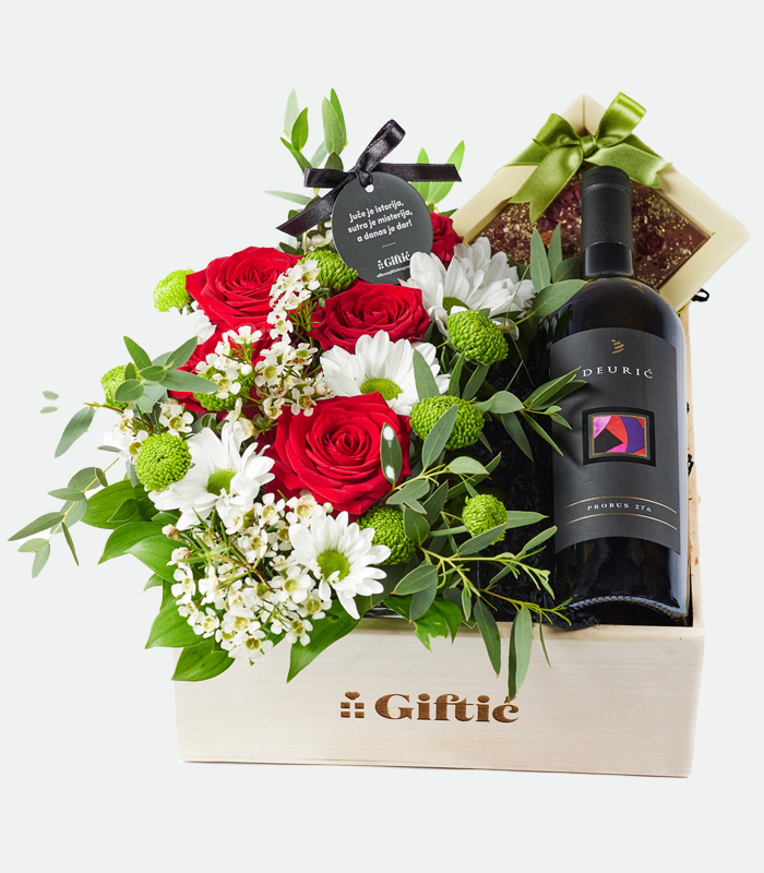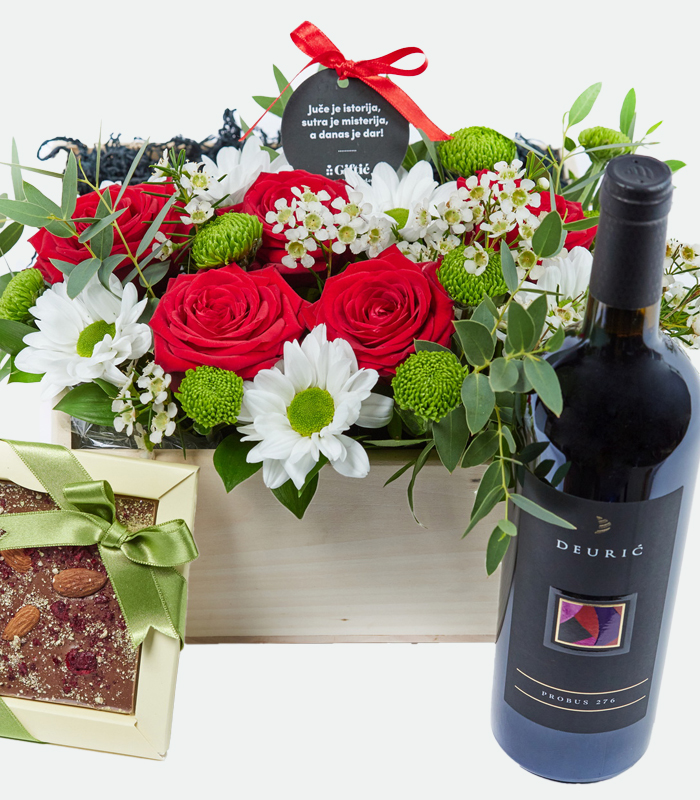 Idealan poklon za opuštanje sa dragom osobom. Poklon paket sa cvetnim aranžmanom sačinjen od ruža i karanfila, uparen sa kvalitetnim crnim vinom sorte Probus vinarije Deurić i specijalnom čokoladom sa bademom, liofilizovanom višnjom i pistaćima.