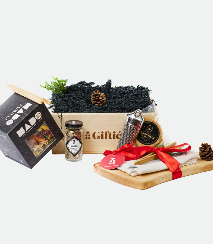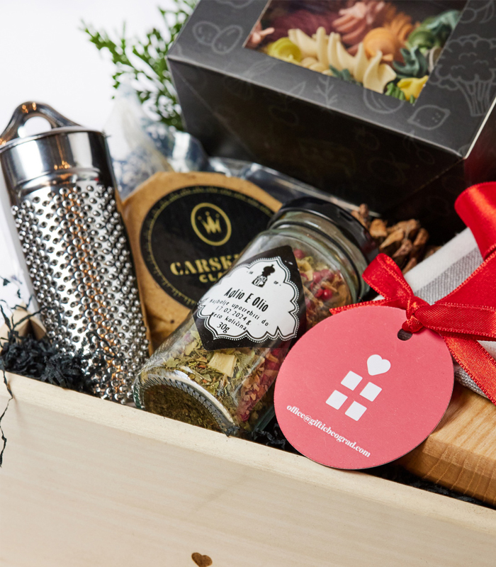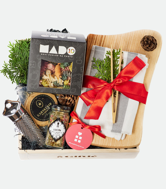 Nije najpoznatiji mjuzikl, ali Mamma Mia poklon paket budi sva čula i pokreće svaki deo tela. Ukoliko imate ljubitelje testenine ili Italije u okruženju, ovo će biti sjajan poklon za njih. Poklon paket sadrži domaće ručno rađene fusile, carski sir i rende od inoxa za još lepšu pastu. Začin Aglio e Olio, drvenu dasku i štipaljku za testeninu. Na sve to dodajemo kuhinjsku krpu koja će pomoći da sve ostane čisto i blistavo.