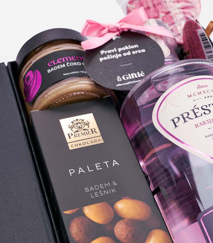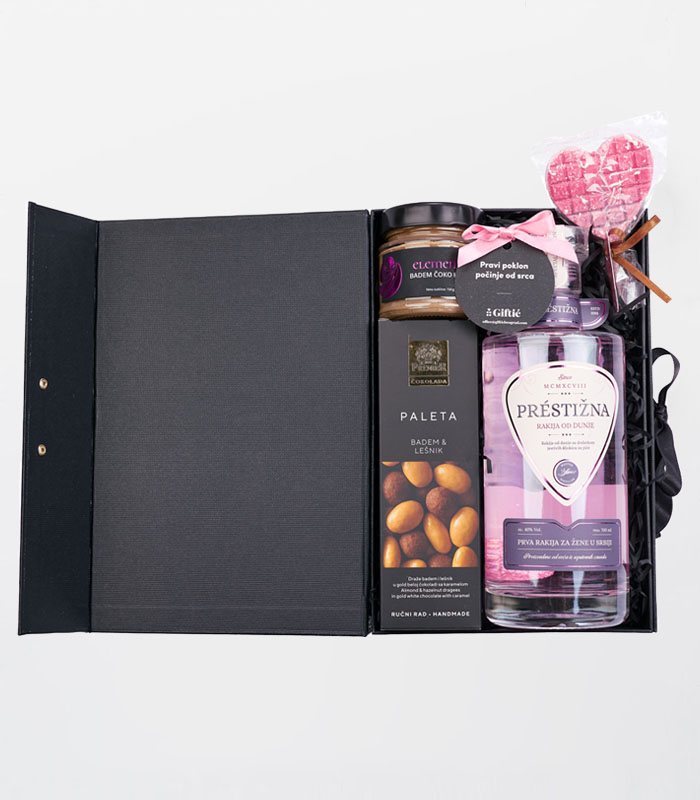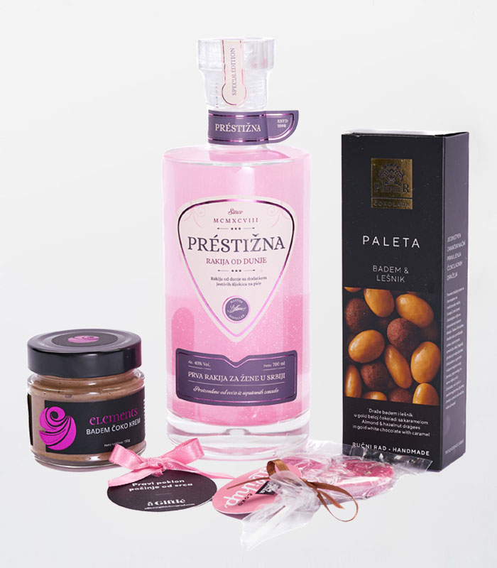 Prva dunjeva rakija sa jestivim šljokicama oduševiće svaku damu svojim ukusom i elegantnim izgledom. Lio draže od badema uparen sa najkvalitetnijim namazom od badema stvara savršen slatki užitak, dok čokoladni Lilihip zaokružuje ovaj prestižni poklon.