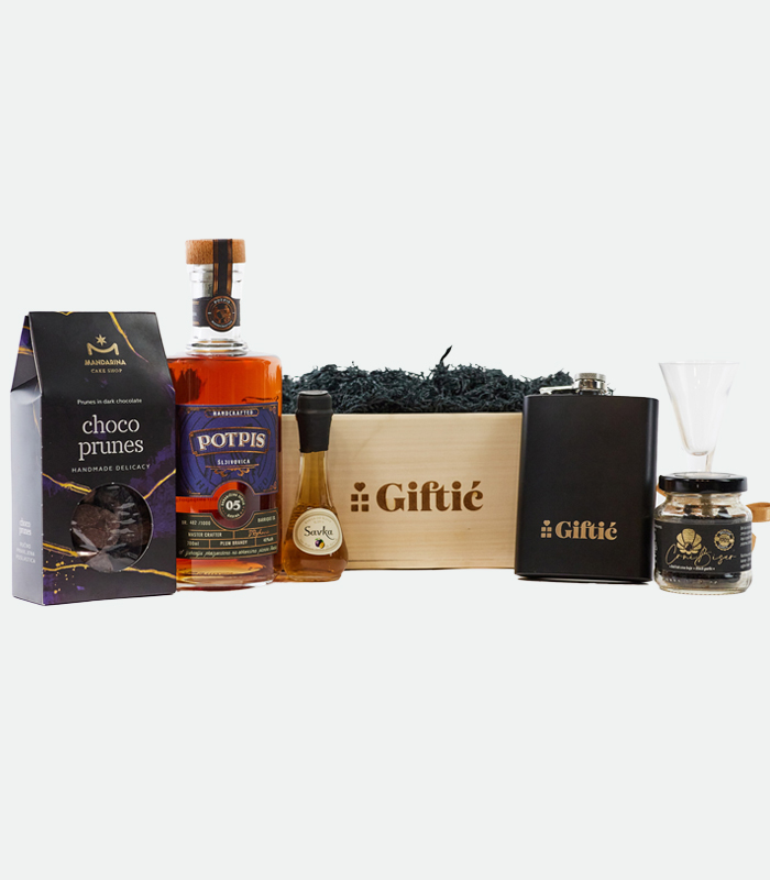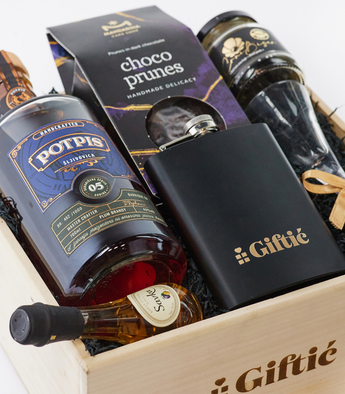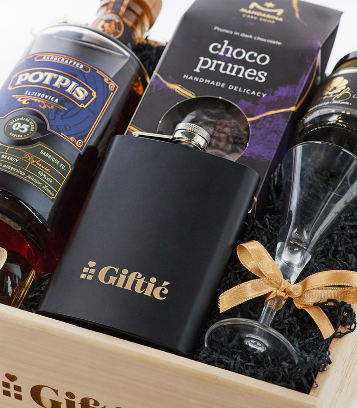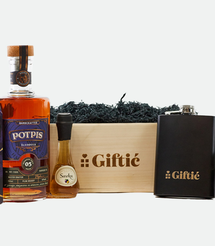 Napomena: Graviranje kutije i brendiranje metalne pljoske menja izraženu cenu poklona