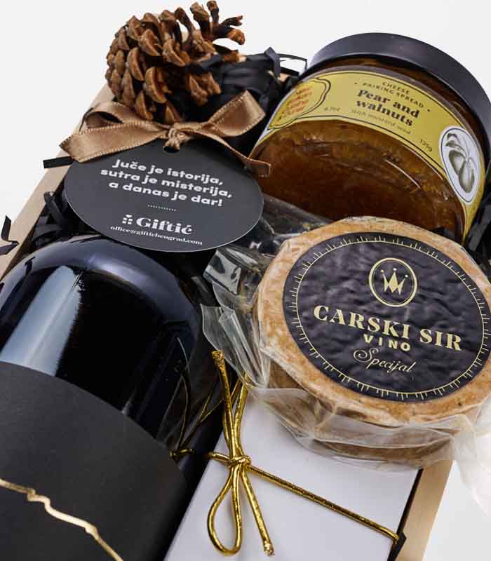 Poklon set Tajna gurmana, govori da gurmani nikada ne otkrivaju svoje tajne. Za prave gurmane koji vole hedonizam i znaju kako da ugode sebi. Vrhunsko crveno vino Zemna, za večernje opuštanje upareno sa premium carskim sirom i namazom za sir od kruške. Za kraj smo uvrstili luksuznu selekciju pralina. Poklon namenjen poslovnim partnerima, saradnicima, za nju i njega prilagodiće se svačijem ukusu i oboriti s nogu.