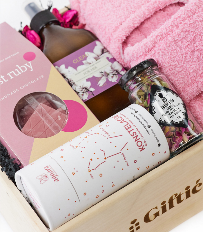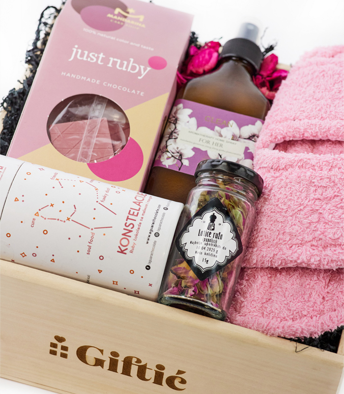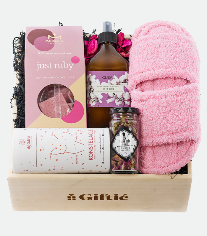 Aromaterapijski parferm za nju, stvara osećaj harmonije, podiže raspoloženje, smanjuje nemir. Čine ga ulja geranijuma, ylang ylang-a, nerolija i mandarine, a ceo užitak upotpunjuju frotirske papuče za sigurnije kućno koračanje. Ruby čokolada sjajno uparena sa Ruby čoko napitkom sa malinom i mangom dobitna kombinacija koja se zove uživanje! Na kraju za ukusnu večeru idealno će pomoći latice od ruža koje su sjajan dodatak pirinču, dinstanim jelima i ribi.