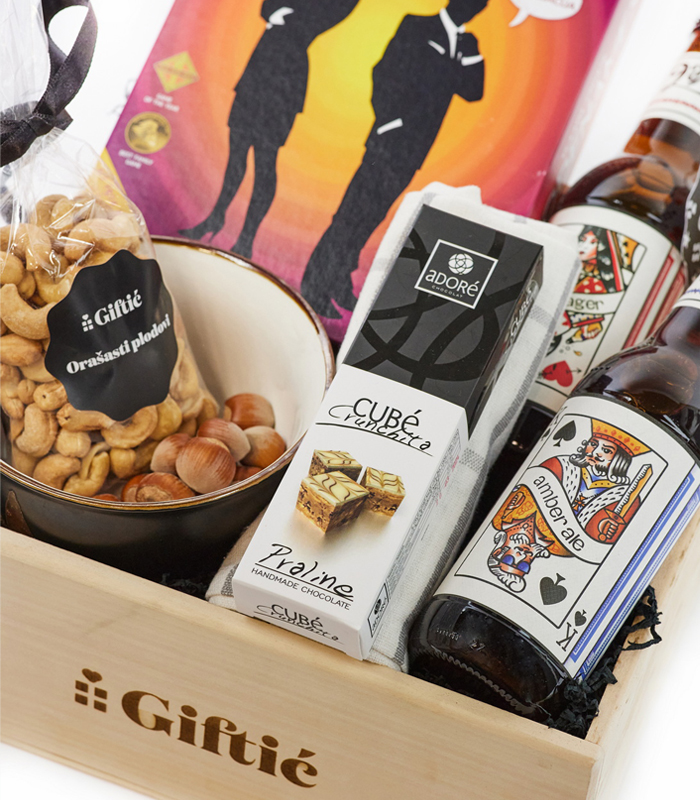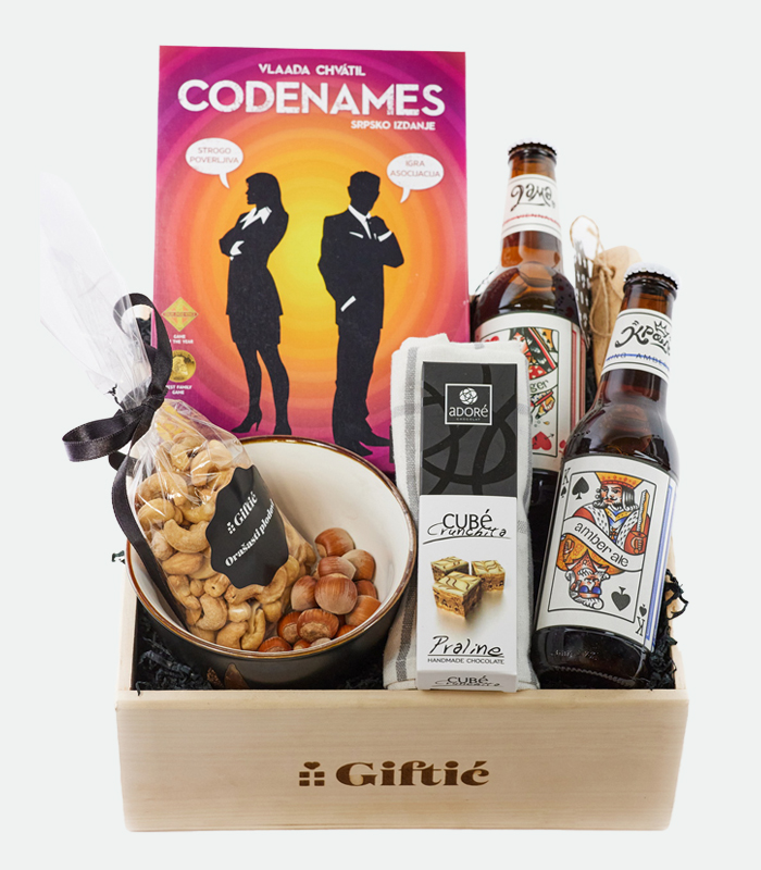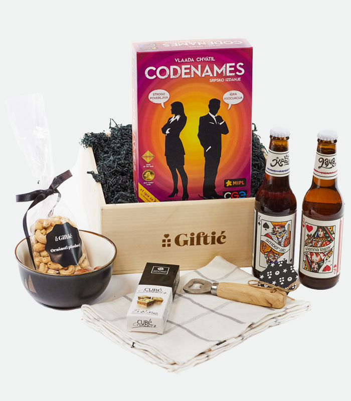 Zabavite se uz društvenu igru po želji, naš predlog je Codenames koji možete igrati i samo u dvoje. Iskoristite drveni otvarač za pivo Dama za nju i Kralj za njega. Uz sve to orašasti plodovi za grickanje i pun ugođaj. Pamučna krpa da obrišete ruke da ne umastite igricu. Na kraju vašu pobedu zasladite jednom domaćom pralinom.