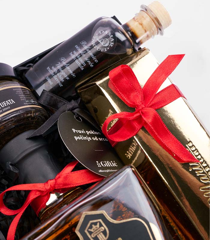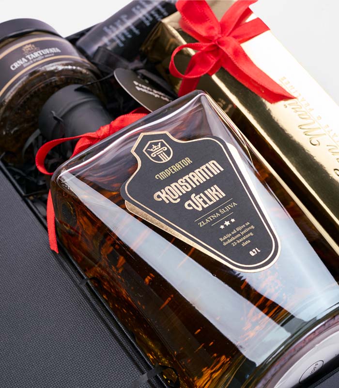 Kažu da nije sve što sija zlato, ali poklon set Zlatni Pek zaista sija jer je sav u zlatu. Kao da ste plovili rekom Pek i kroz drvene posude zvane „Ispitak“ pronašli pravo bogatstvo. Zlatna rakija od šljive sa 23-karatnim jestivim zlatom simbolizuje vrhunski kvalitet i luksuz. Zlatna poluga vrhunske belgijske čokolade možda neće obojiti zube u zlatnu boju, ali garantuje izuzetan ukus. Crna tartufata i balsamico od tartufa otvaraju apetit i savršeno se kombinuju sa rakijom od šljive, stvarajući nezaboravan doživljaj za sve čulo ukusa.
